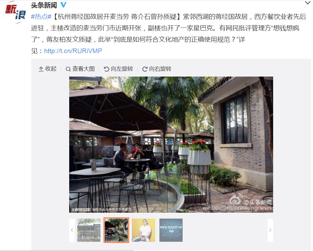蔣經國曾經帶著蔣方良一起到杭州西湖邊居住,而這棟故居,現在卻變成星巴克和麥當勞,蔣家後代蔣友柏批評「踐踏歷史」,更在微博上寫下,有些事就是不想做,他本來承接裝修案,後來發現是開麥當勞,結果他就「裸退」不接了。
