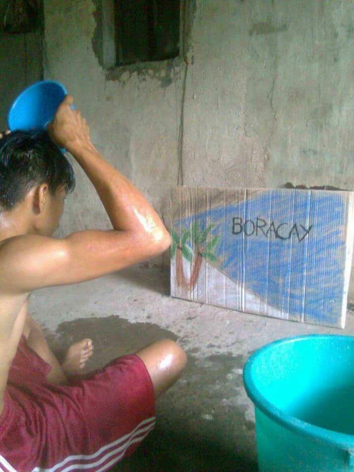 來自菲律賓馬尼拉的男子Rafael-nonog Gomez一直夢想著能去長灘島玩,雖然他的夢想國度也在菲律賓,但因為家裡貧困,因此旅行對他來說是種奢望。Rafael在3月中PO出了一張照片,照片中的他上半身打赤膊、只穿著短褲,癡癡地望著眼前自己畫的長灘島一邊洗頭,並寫道:「夏天就應該要這樣。」KUSO的幻想自己正在長灘島