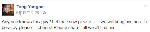 沒想到Rafael的照片被熱烈轉發,還有網友將他洗頭的照片與長灘島風景合成。就在2個月後,當地一位網友Tong Yangco看見Rafael的照片,並在臉書發文詢問「有誰認識這個人嗎?請讓我知道,我們想帶他來長灘島,請分享這項訊息,直到我們找到他」,PO文一出,不到一天的時間就有上百則分享,兩人也順利連繫上。
