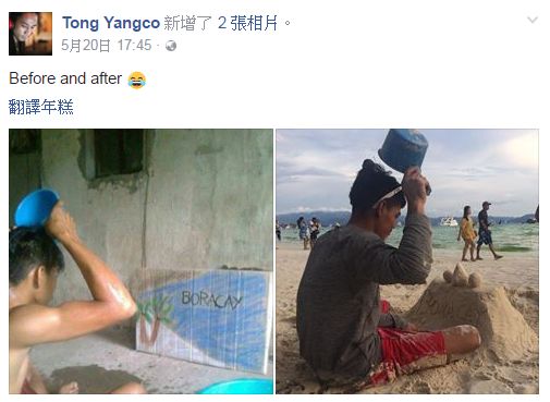 Rafael相當感動,他從沒想過放上臉書的照片,能讓他美夢成真,一直到旅程結束時,他都持續發文感謝大家的幫忙。而Tong Yangco還拍下了長灘島洗頭的對比照,同樣洗頭的姿勢卻是不同場景,不少網友也紛紛留言大讚Tong Yangco幫助少年