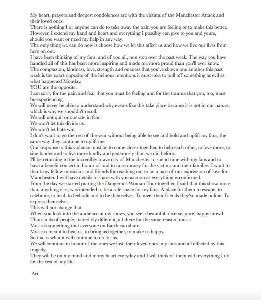 恐攻事件後,亞莉安娜透過發言人向粉絲報平安,但對於演唱會中的受難者她一直感到相當自責,情緒久久無法平復,還在臉書上向大家道歉,並表示「心碎,無話可說」。