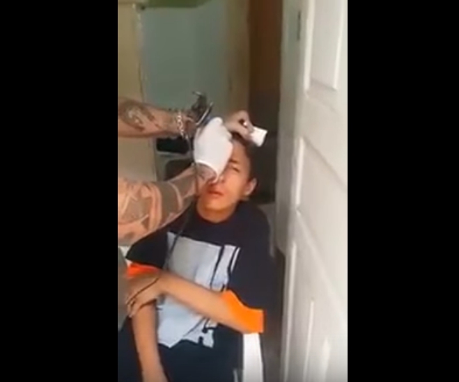 ▼少年被刺青師動用私刑,刺上「我是小偷」在額頭,表情痛苦