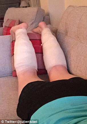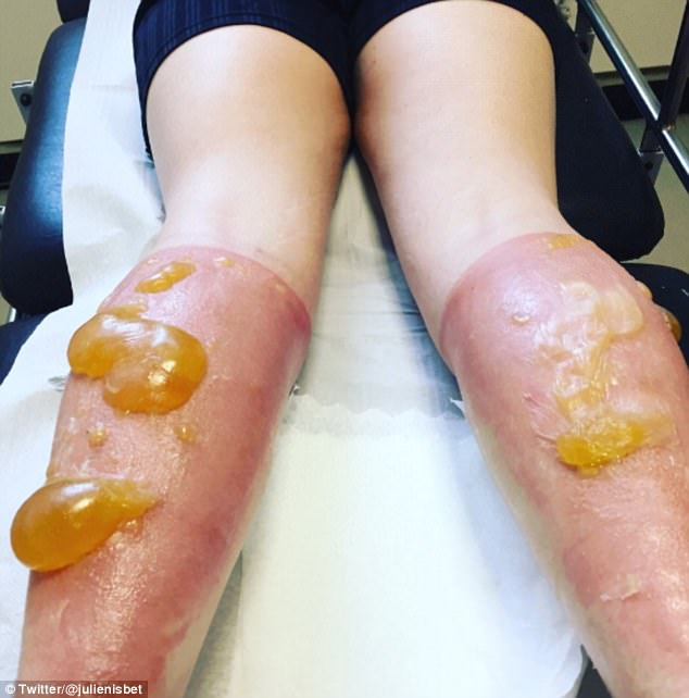 只是當她抵達終點時,才發現自己雙腳的小腿上冒出許多大大小小的水泡,同時伴隨著強烈的刺痛感,緊急就醫後,醫生在她腿上綁上繃帶,以隔絕避免感染。但是可怕的是,當她再度回診要更換繃帶時,原本的小水泡不僅變得更大,還形成橘色的巨型膿包,看上去宛如一個個水球黏在皮膚上。