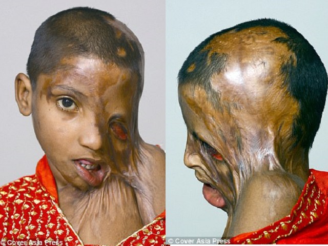 印度一名父親因不滿妻子外遇,決定趁妻子熟睡時潑硫酸報復,沒想到潑到的不是妻子,而是當時4歲的女兒,導致她「半臉融化」,全身有40%的皮膚灼傷,而妻子無法支付龐大醫藥費,而無法讓她送醫治療。