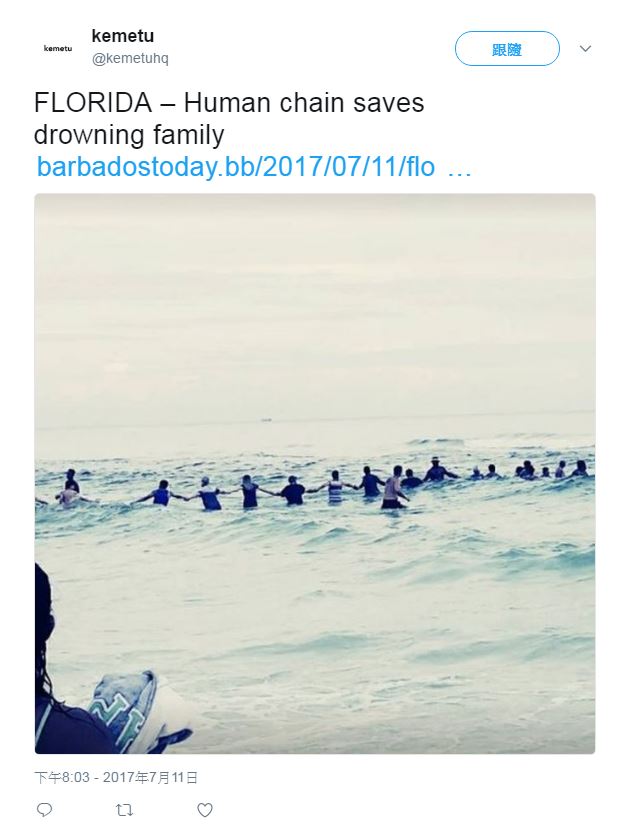 美國佛羅里達海邊遭巨浪襲擊,9名泳客遭浪沖離海岸受困海中,包含一對小兄弟,一旁泳客發現後,立刻呼叫大家將手牽起來,形成一條長長的「手鍊」,順利的將小兄弟救回岸邊。