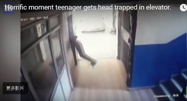 電梯小窗中想要查看電梯位置,沒想到卻遭突然到達的電梯重擊後腦,整個人甚至被撞得飛起,雙腳