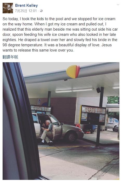 美國田納西州納西維爾(Nashville)牧師凱利(Brent Kelley)表示,當時天氣太熱,他帶著孩子去游泳後,在回程途中特別停車買冰淇淋要給孩子吃,結果就看到動人的一幕,一位白髮蒼蒼的老先生正溫柔的替妻子繫紙巾在脖子上,並耐心的餵對方吃冰淇淋。這一幕讓他深受感動,於是立刻用手機紀錄下來,並上傳到臉書,寫下「這是真愛最美好的展現」。