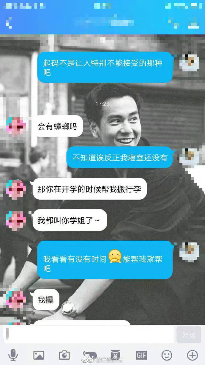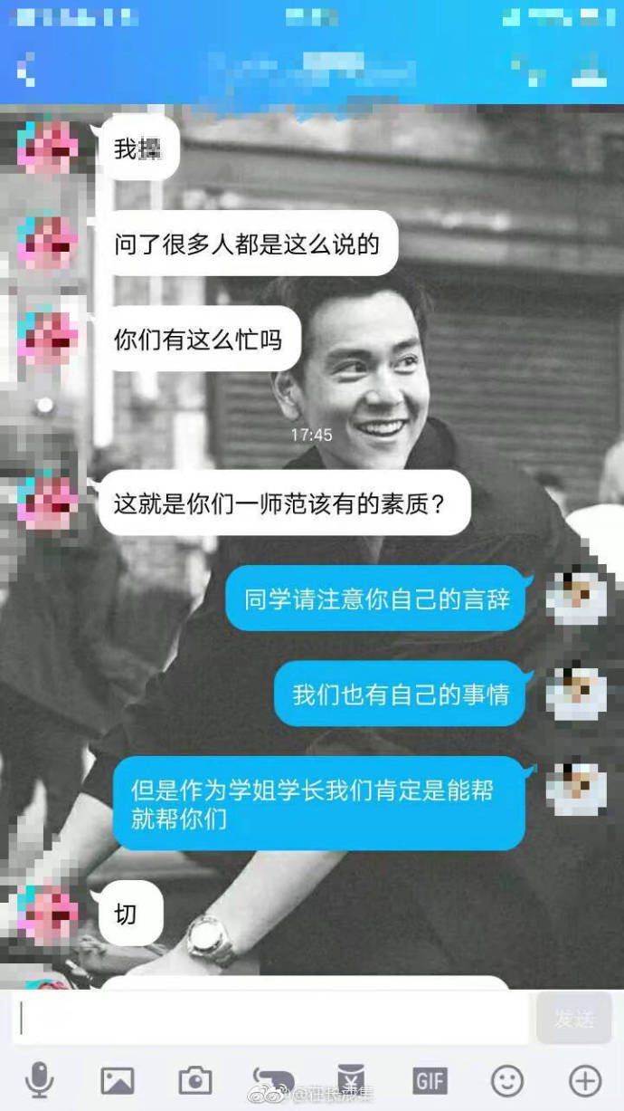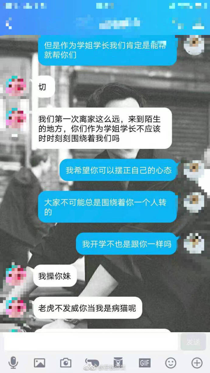 網路上瘋傳幾張對話截圖,事發當事人是湖南第一師範學院學生,他接到一位新生訊息,新生一開始還算禮貌問好,問完宿舍問題後便問學姐說「那你在開學的時候幫我搬行李。我都叫你學姐了。」學姐回「我看看有沒有時間,能幫我就幫吧」,結果這名新生突然爆氣以髒話回嗆「我X;你們有這麼忙嗎」,學姐被對方惹怒,提醒對方注意自己的言行。這名新生惱羞成怒繼續飆罵「你們做為學長姐不應該時時刻刻圍繞著我們嗎」,語畢又附上一句粗口「我X你妹,老虎不發威你當我是病貓呢」。