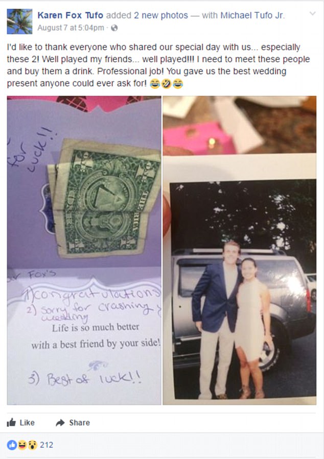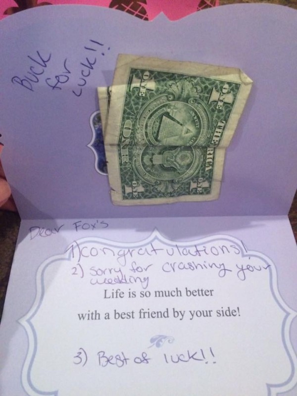 幸運錢」的1美元,以及一張小情侶合照的拍立得。新娘凱倫(Karen Fox)看到賀卡才知道婚禮被亂入,其實凱倫早已發現這對陌生情侶,但一直誤認為是丈夫的朋友,查看婚禮上的照片時,小情侶還對鏡頭燦爛微笑。