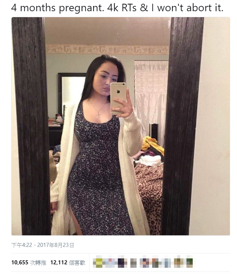根據外媒報導,這名女網友「Saipanting」日(23)前在自己的推特上發出一張自拍照,由照片可見這名女網友小腹微凸,身穿一襲深色碎花低胸長洋裝,寫到「懷孕4個月,有4000次的轉發,我就不會放棄他。」言下之意表示,若未達成目標,將會去墮胎,貼文一出引發網友們謾罵