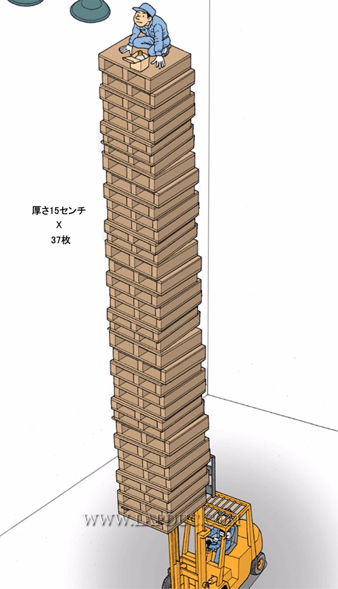 據了解,消息一傳出,引起許多網友討論,就有日本網友做出了一張示意圖,圖標記到,每塊棧板高度大約15公分,一共疊了37塊,高度接近3層樓高,就有人質疑這起意外的真實性,畢竟「疊30塊就很晃了,竟然疊到37塊」,也有人認為,即使真的疊了37塊棧板再加上推高機的高度,一般人也無法碰到天花板。
