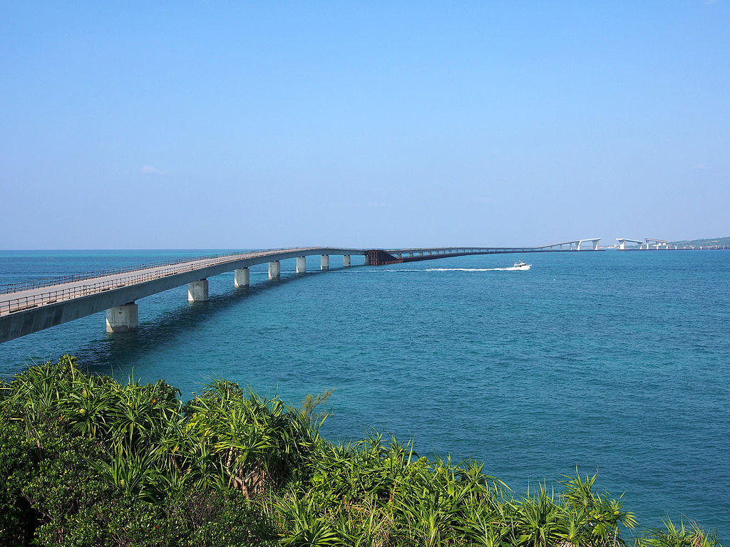 連接宮古島和一旁離島的伊良部大橋全長3540公尺,可讓船隻通行,在2015年1月正式啟用,是日本免收通行費的最長大橋,橋上除了設有雙向的單線道之外,還有路肩可供單車和行人使用。