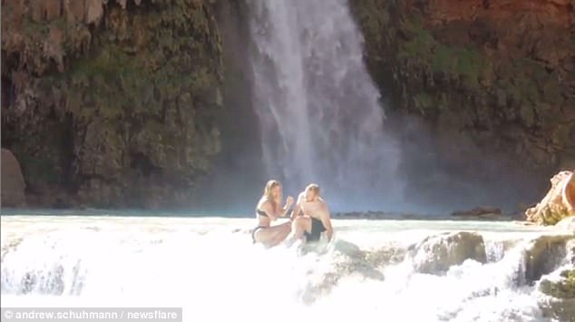 向交往6年的女友Kammie求婚,一旁的瀑布流瀉而下,景色相當優美。