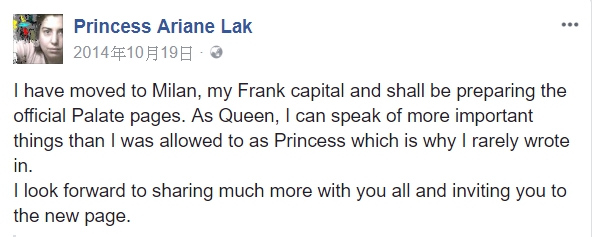 ▼拉克2014曾在臉書PO文,表示自己搬到米蘭(圖/Princess Ariane Lak 臉書)