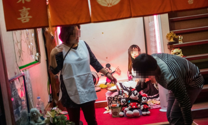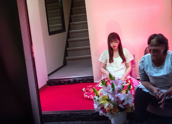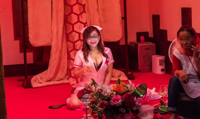 曝光的照片中,每個小姐爭奇鬥艷,都有不同的「主題」,顏值都非常高,屋內擺放娃娃、花朵,布置相當精美,旁邊還會坐著一個奶奶級別的「媽媽桑」,招呼客人進店內,並保護小姐,在有客人經過時,會出聲提醒小姐要微笑與客人打招呼,光彩照人的小姐與一臉愁容的「媽媽桑」形成強烈的對比。