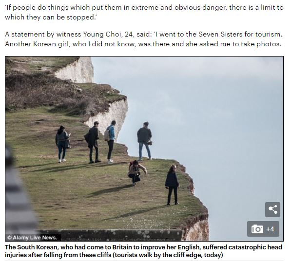 《每日郵報》報導,23歲的南韓女子金惠媛(Hyewon Kim)到英國增進英文能力,今年6月她至東薩塞克斯郡的「七姐妹斷崖」遊玩,卻不慎摔落懸崖。在這鬼斧神工的景緻中,金惠媛想拍個絕美的「跳躍照」因此便請一旁陌生的南韓女子幫忙拍照,未料因為她太靠近懸崖邊,落下時一隻腳不慎踩空,竟這樣摔落懸崖。