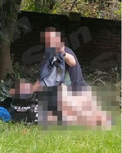 ▼男子遭路人勸阻後,拿牛仔褲打算遮身(圖/翻攝太陽報)