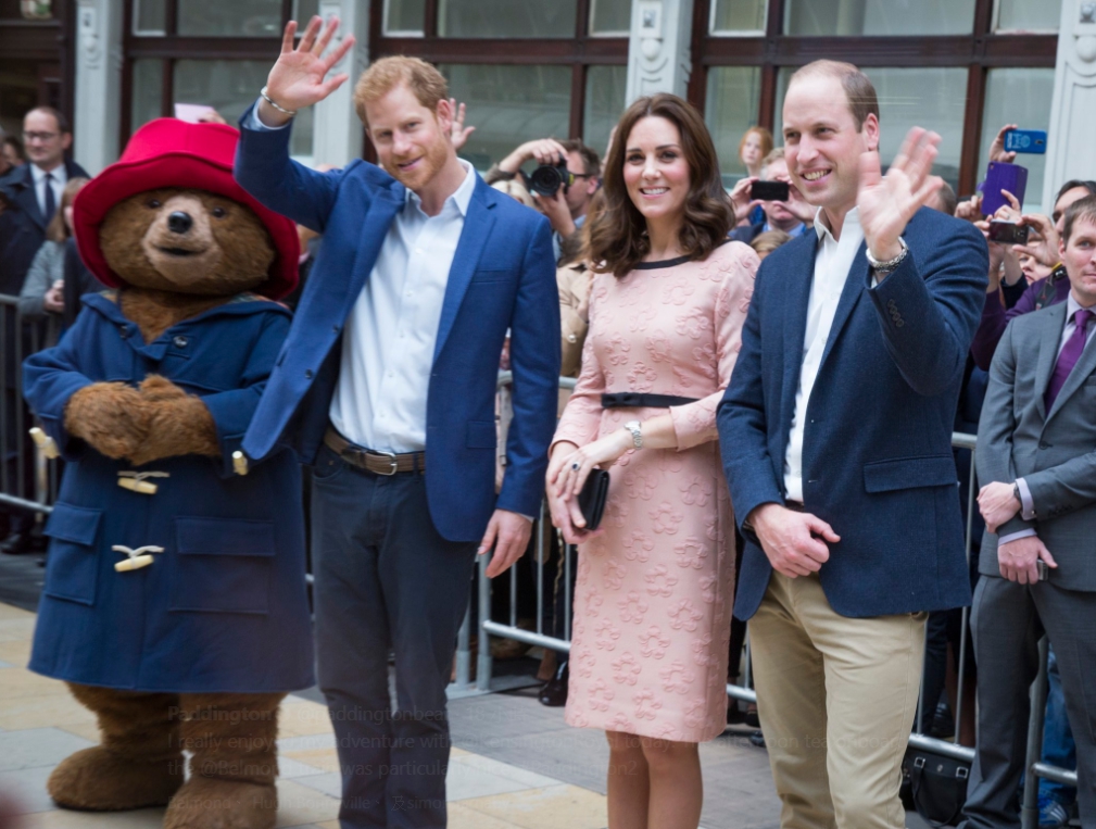 英國王室臉書表示,威廉王子作為英國影藝學院院長,和凱特王妃和哈利王子一同到帕丁頓車站替其贊助旅行的小朋友送行,一行人先上火車與小朋友打招呼,之後在月台上等待火車發車,就在這時,帕丁頓熊開始隨著現場音樂起舞,並向凱特王妃邀舞。