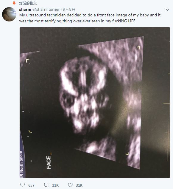 每個寶寶都是母親辛苦懷胎10個月愛的結晶,到醫院檢查時都會留張超音波照做紀念。不過,澳洲有位準媽媽特納(Sharni Turner),她分享了自己的超音波照,卻說「這是我看過最可怕的景象!」只見照片中胎兒的臉正對著螢幕,眼神相當凶悍,不少網友看了不禁聯想到佛地魔、奪魂鋸,甚至還有人嚇到叫特納「趕快去墮胎!」