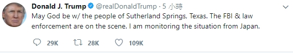 事發後,人在日本的美國總統川普,也第一時間於推特發文「願上帝與德州薩瑟蘭泉的民眾同在,FBI和執法單位已在現場,我會從日本持續掌握狀況。」