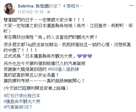 ▼(圖/翻攝自Sabrina. 吳怡德臉書)