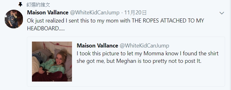 而梅森看到留言後,也明確回答,那是「拿來綑綁用的」,不過隔沒多久,他才赫然發現不對勁,因為一開始就傳這張照片給媽媽看了,當然還包含床頭的那個繩子,於是還在推特發文表示懊悔。