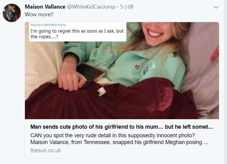 梅森原先只是將女友拿著襯衫的照片傳給媽媽看,但因為發現女友的燦笑實在太美,於是忍不住在推特上PO這張照片,並炫耀女友實在太正,不過有網友馬上注意到這張看似放閃的照片竟有亮點,一名網友就留言問他,「你床頭上擺的繩子是什麼…?」網友還看見,紅色繩子上有兩個圈圈,引起無限遐想,似乎揭露出兩人特殊的情趣愛好。