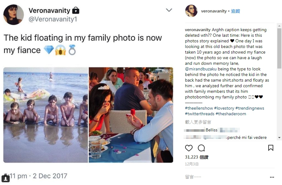 童年照片時才發現,照片中在她身後游泳的小男孩竟然就是他。(圖/翻攝自veronavanity Instagram)
