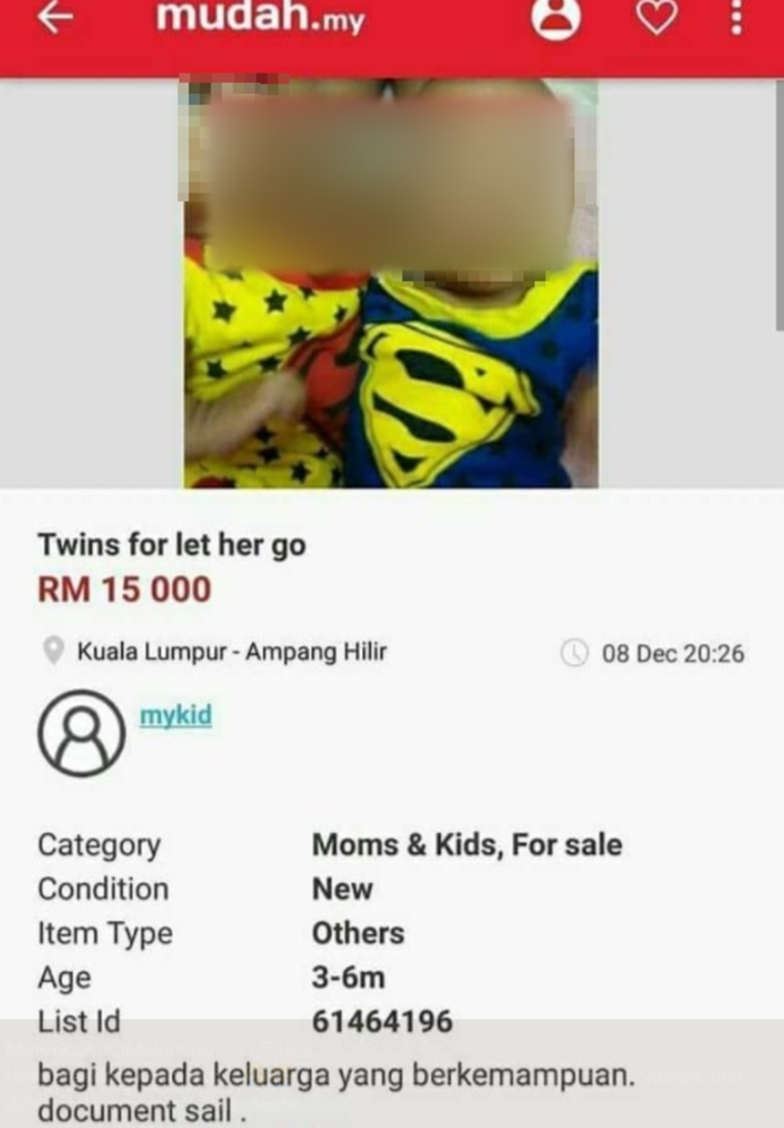 吉隆坡總警長證實,拍賣網站上的雙胞胎就是他們的孩子,小小年紀初嚐性行為,卻沒有做好防護措施就提槍上陣。小倆口不慎懷孕沒有及時處理,辛苦懷胎10月生下來又不願扶養,連丟給親戚也被拒絕,最後才會選擇把孩子丟到網路上拍賣,完全不想對毫無行為能力的孩子們負責,警方也要求拍賣網站盡速將販賣資訊撤下。