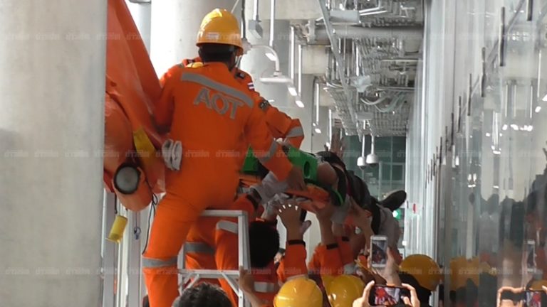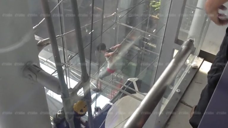 《泰國世界日報》報導,事發在曼谷國際機場,這名穿著緊身運動上衣、牛仔短褲的歐洲女子昨(13)日徒手爬到候機大廳6樓,在離地20公尺的鋼樑上玩倒掛,僅以腳背當作支撐點,更可怕的是,她還直接放手落在下方的鋼條上,從6樓翻下4樓,身上沒有任何防護措施,讓旁人看得心驚膽顫,機場工作人員怕她有生命危險,趕緊請求支援到場。