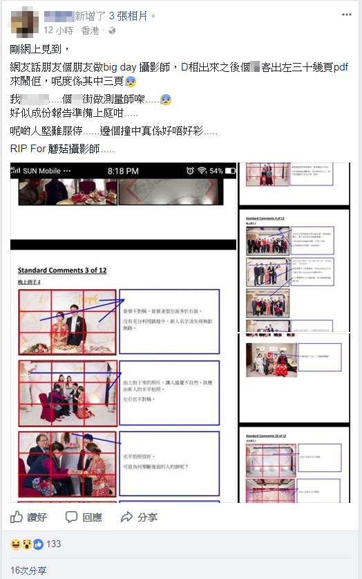 ▼香港網友在臉書發文為婚攝朋友打抱不平