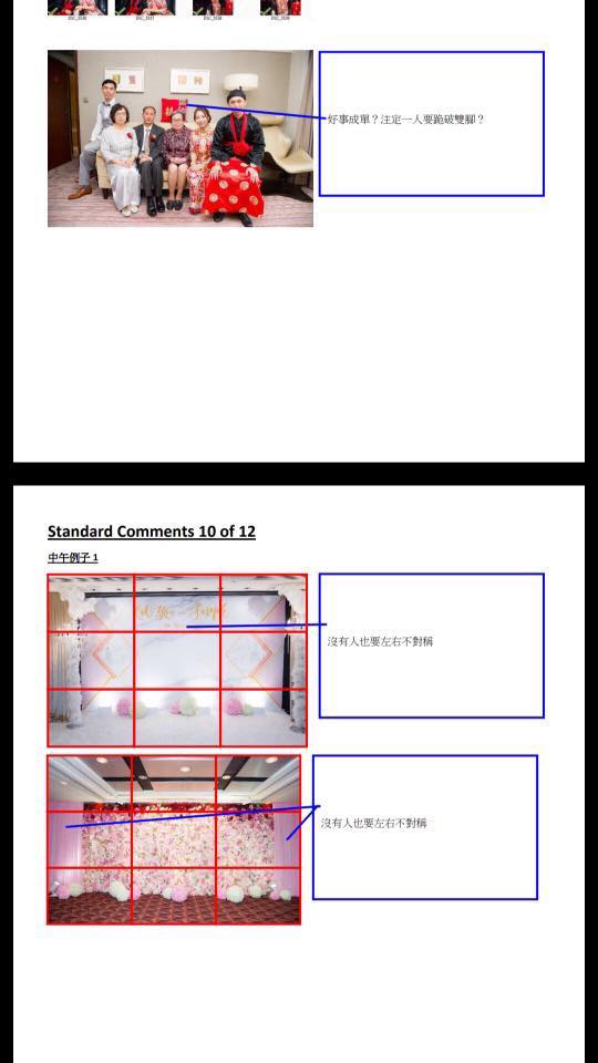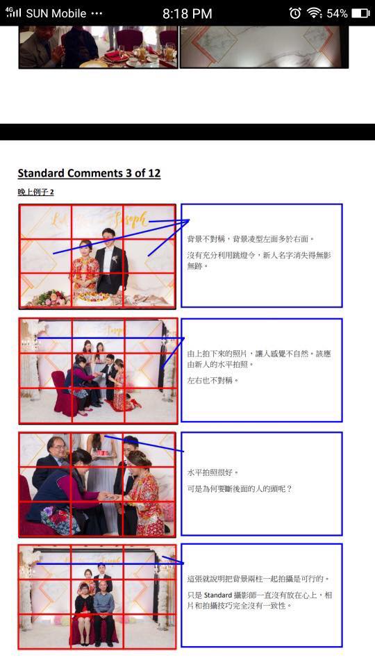 只見流出的「指導手冊」當中,新人將每張照片都放上了標準「九宮格」來看構圖,並點出其中不足的地方,包括「背景不對稱」、「沒有充分利用跳燈令,新人名字消失得無影無跡」、「由上拍下來的照片,讓人感覺不自然」、「構圖角度啼笑皆非」、「相片和拍攝技巧完全沒有一致性」等等。