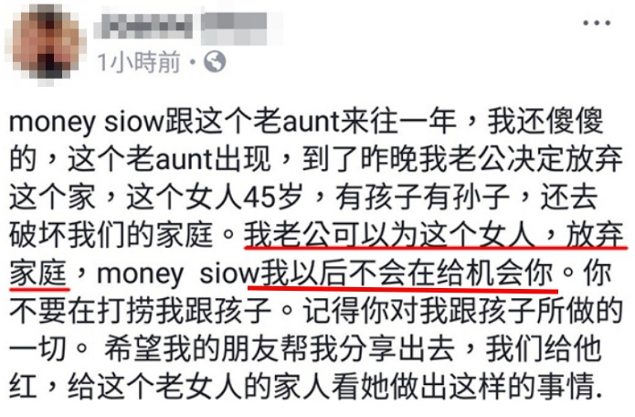 詩華日報》報導,女網友在臉書PO文表示,老公與「老三」已經曖昧一兩年,但她卻渾然不知,直到老公與「老三」性愛後傳來曖昧影片向她示威,她才知道自己被劈腿,怎樣也沒想到自己辛辛苦苦將小孩養大,老公卻在半夜傳來影片說自己剛和女友發生關係,並挑釁說自己喜歡老女人,她心寒表示「為了這個女人,我老公決定放棄這個家…」。由於老公結婚後心思一直都不在家庭,她也終於忍無可忍,決定「再也不會給老公機會」。原PO還表示,希望大家能幫她分享文章,讓「老三」的家人都知道自己的媽媽、奶奶在外面和人做出這樣見不得人的事。