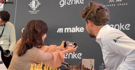 合影對手拍完秒變臉檢舉。世界棋王「卡爾森」在一場公開賽跟哈薩克女棋手對弈,賽前開心的應對方邀請燦笑合照,沒想到下一秒竟然當場檢舉對方違規,讓對方的手機直接被沒收,引發熱議。女棋手見到偶像「世界棋王」卡爾森,興奮地拿出手機,拜託對方合照一張,棋王大方答應後,還對著鏡頭,露出燦爛微笑,沒想到下一秒,當場變臉檢舉,以為遇到親民偶像,沒想到棋王,轉頭就向裁判檢舉「違規攜帶手機」。。裁判也立刻上前沒收設備,原來職業西洋棋賽,為了防止作弊,嚴禁選手攜帶電子產品,不過被問到與棋王對戰心情,女棋手似乎還沉浸在追星喜悅。哈薩......