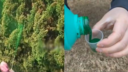 綠。。大陸大連一處社區因為覺得樹木枯黃,希望找人來整理綠植,沒想到民眾以為廠商直接噴綠漆想粉飾太平,直接向政府檢舉。政府工作人員:「噴那個「葉綠肥」是一種肥料,顏色是綠的,不是像老百姓說的噴漆什麼的。」原來這種肥料在大陸叫做「飄綠草衣」是一種增綠劑,可以幫助植物行光合作用,既能增色也是肥料,而且實這種作法相當常見。大陸網路新聞:「噴播的是高性能噴播基材,具有很好的儲水保溫性,能夠做到快速復綠長久持綠更不會汙染環境。」光禿禿的邊坡用混有種子的營養液大面積噴灑,不到半年就長出綠油油的草地,在四川宜賓也有民眾拍下......